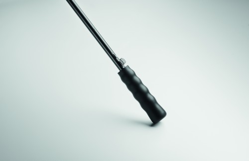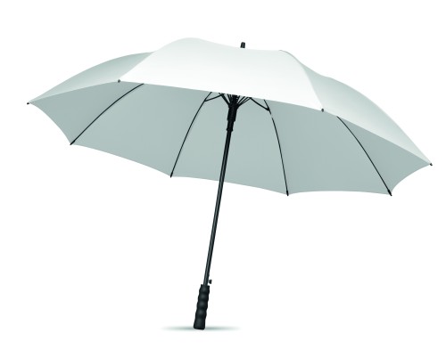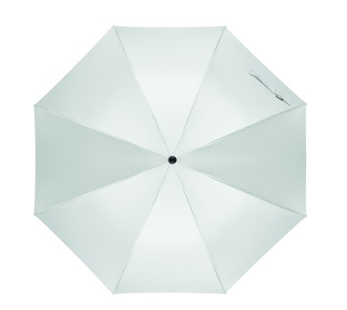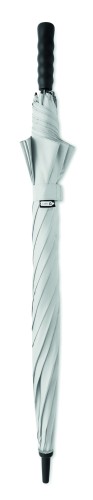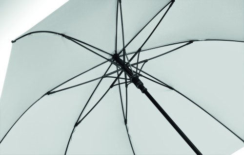 27 inch auto open wind-proof umbrella in 190T RPET pongee. Fibreglass shaft and ribs. Wheatstraw and recycled ABS handle. Plastic tips and top.