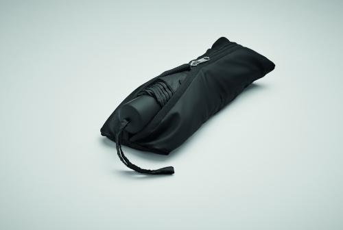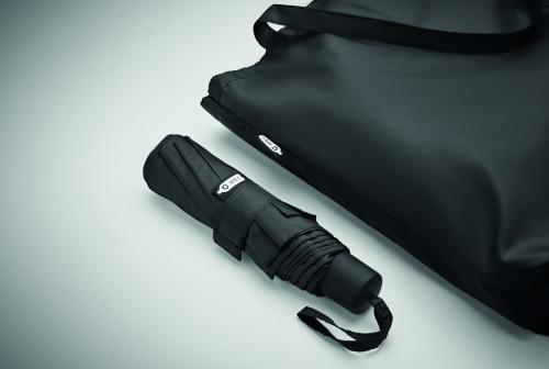 21 inch 3 fold manual open and closure windproof umbrella in 190T RPET pongee. Includes shopping bag pouch. Has hidden zippered compartment to hold umbrella and keep bag contents dry. When bag is not in use, it rolls up and zipper compartment acts as the umbrella sleeve.