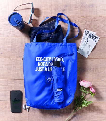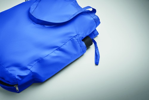 21 inch 3 fold manual open and closure windproof umbrella in 190T RPET pongee. Includes shopping bag pouch. Has hidden zippered compartment to hold umbrella and keep bag contents dry. When bag is not in use, it rolls up and zipper compartment acts as the umbrella sleeve.