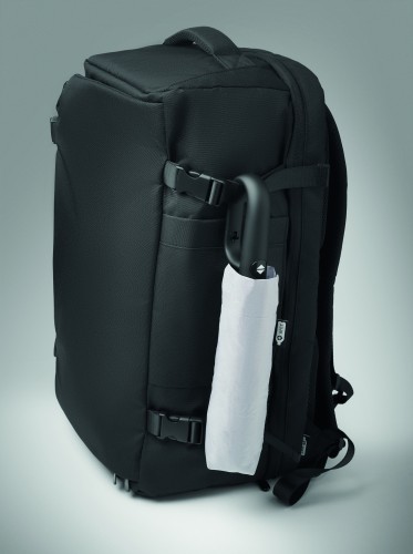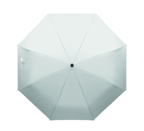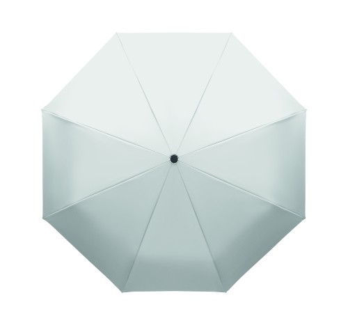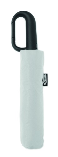 Foldable 21'' windproof umbrella with full black plating fibreglass frame with 2 sections. Fibreglass ribs. 190T RPET pongee panels. D shape carabiner handle w/ rubber finish. Auto open and closure. Includes pouch