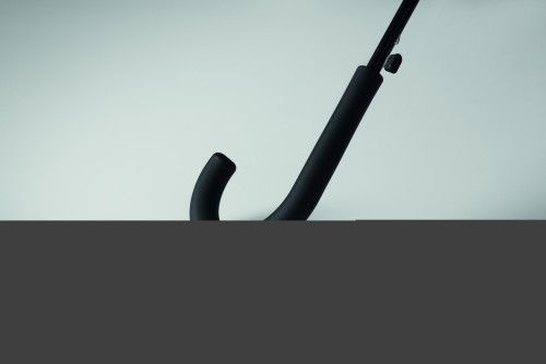 23 inch straight auto open umbrella with black plating metal frame, fibreglass ribs and panels in 190T pongee fabric. Plastic tips and top. Rubberized PP plastic curved handle. Manual closure.