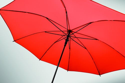 23 inch straight auto open umbrella with black plating metal frame, fibreglass ribs and panels in 190T pongee fabric. Plastic tips and top. Rubberized PP plastic curved handle. Manual closure.