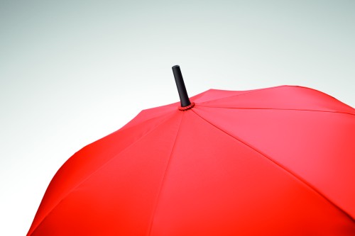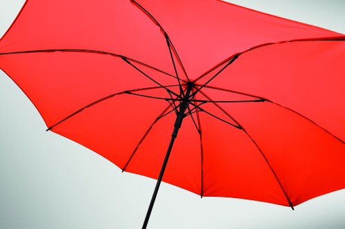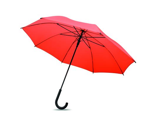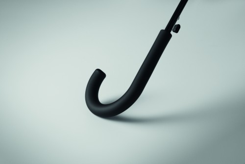 23 inch straight auto open windproof umbrella with full fibreglass frame and panels in 190T pongee fabric. Plastic tips and top. Rubberized PP plastic curved handle. Manual closure.