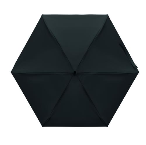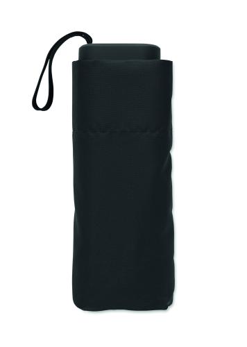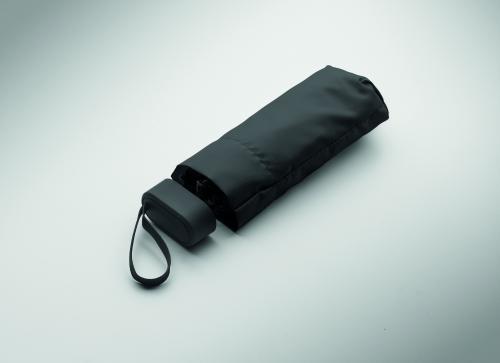 19-inch 5-fold manual umbrella made of 190T pongee with matching pouch. It has a metal and fibreglass windproof frame, black rubberized handle with wrist strap, and compact 17 cm folded size.