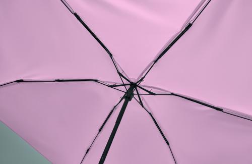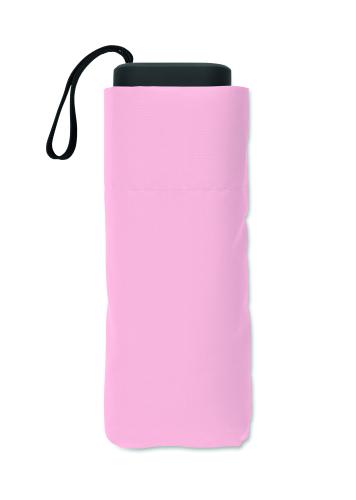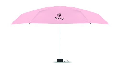 19-inch 5-fold manual umbrella made of 190T pongee with matching pouch. It has a metal and fibreglass windproof frame, black rubberized handle with wrist strap, and compact 17 cm folded size.
