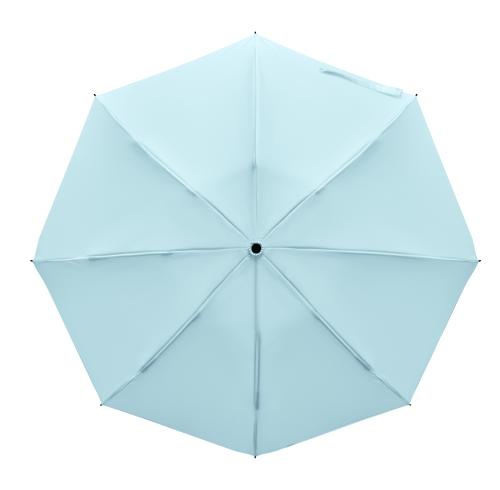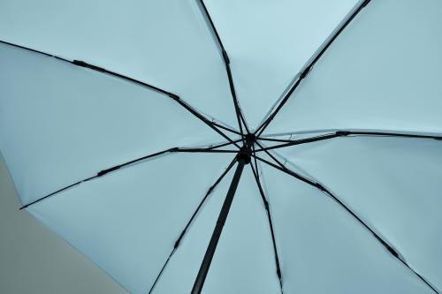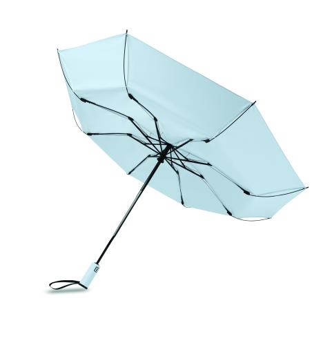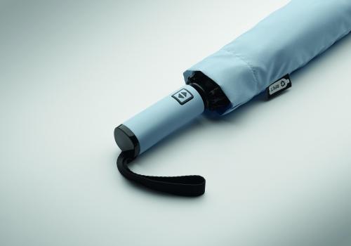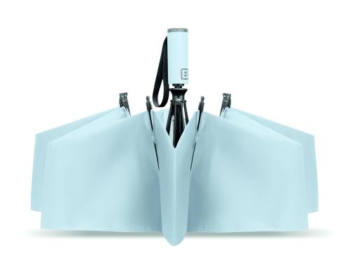 23-inch 3-fold reverse windproof umbrella made of 190T RPET pongee and matching pouch. Auto open and close, full black plating frame, fibreglass ribs, and a rubber-finished ABS handle.