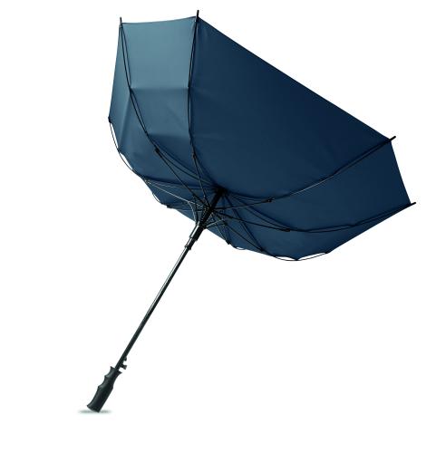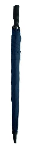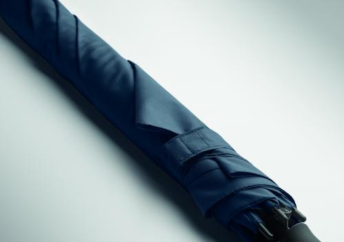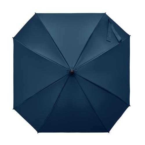 23-inch windproof auto-open square umbrella in 190T pongee polyester. Features full fibreglass frame and ribs, rubber-finished ABS handle.