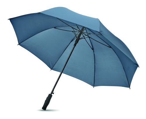 27 inch auto open windproof umbrella in 190T pongee with fiberglass shaft and ribs. Black plastic tips and top. Straight black ABS handle with rubberish finish. Manual closure.