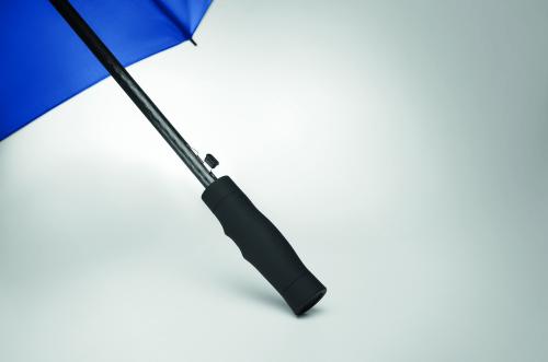 27 inch auto open windproof umbrella in 190T pongee with fiberglass shaft and ribs. Black plastic tips and top. Straight black ABS handle with rubberish finish. Manual closure.