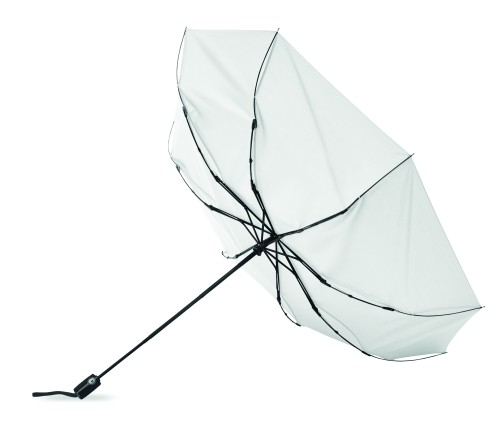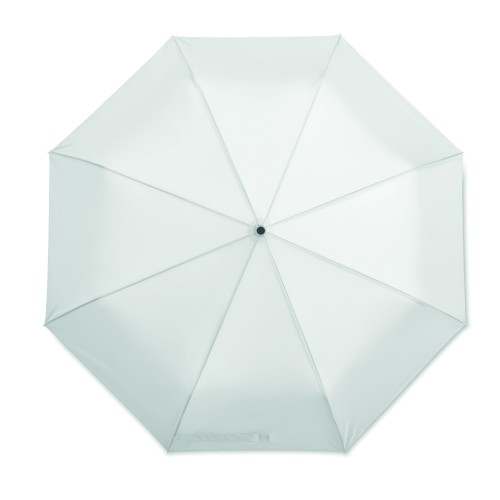 27 inch 3 fold auto open/close windproof umbrella. 190T pongee material black plated steel shaft. Fibreglass ribs, 1 part black plating inside frame. Black PP handle with button. With matching pouch.