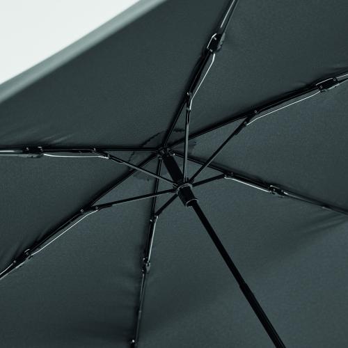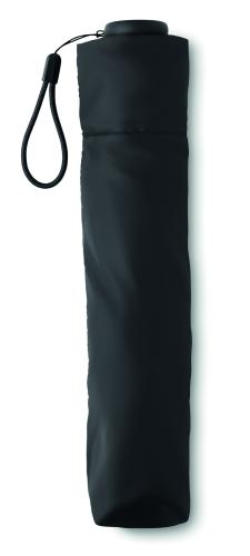 Mini 3 fold ultra light (100gr.) 19 inch manual open windproof umbrella in 30D pongee polyester with black carbon fibre shaft. Black carbon fibre ribs and plastic tips. Manual closure. Presented in pouch.