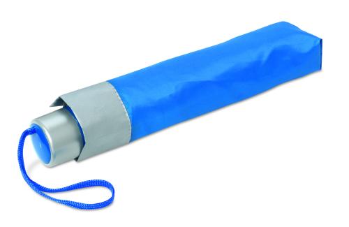 21 inch manual open umbrella in 190T polyester with zincify plating metal shaft and tips. Black plating metal ribs. Panels in colour with silver coating on back. Plastic handle in color with silver rim and black wrist strap. 3 sections fold. Includes matching pouch with silver trim. Manual closure.
