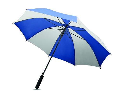 27 inch auto open umbrella in 190T pongee with black plated metal shaft and ribs. Black plastic tips. Straight black EVA handle. Manual closure.