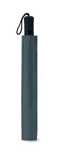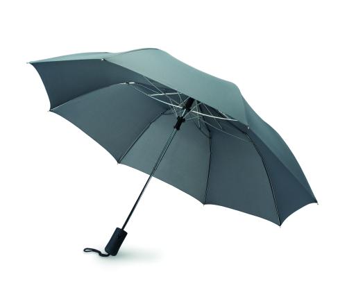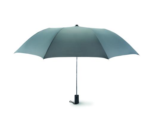 21 inch 2 fold auto open umbrella in 190T pongee with zinc plated steel shaft, ribs and tips. Black rubberised ABS handle. Includes matching pouch. Manual closure.