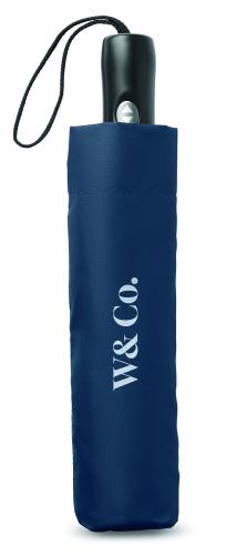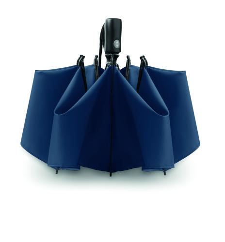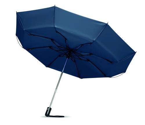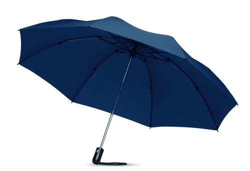 23 inch 3 fold auto open/close reversible umbrella in 190T pongee material chrome plating steel shaft. Fibre-glass rib and 1 part black plating inside frame. Black ABS handle with button. Includes matching pouch.