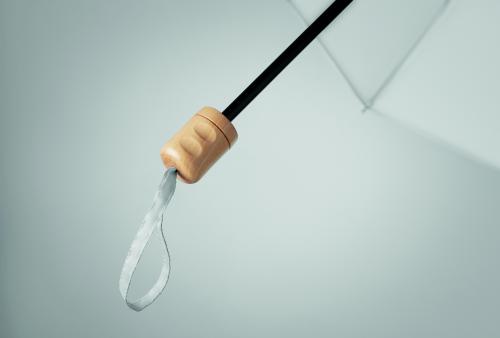 Foldable 21 inch umbrella, 3 sections with 190T RPET pongee fabric, black plated frame and ribs with wooden handle. Manual open and closure. Self material pouch.