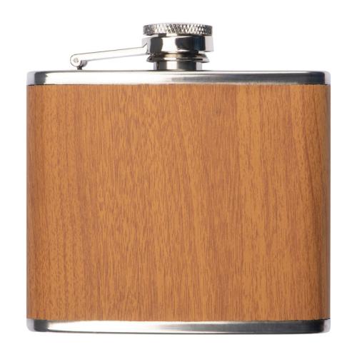 Stainless steel hip flask with wooden coating, safety screw mechanism and a capacity of 170 ml.