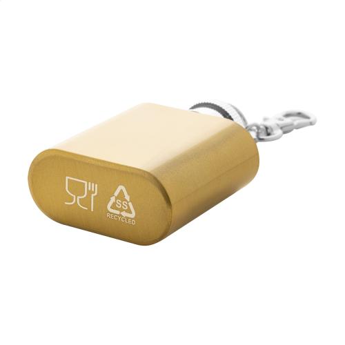 Recycled stainless steel mini hip flask with shiny metallic finish and carabiner keyring. 30 ml.