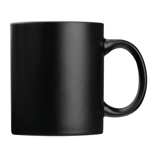 Ceramic cup with black outer surface and coloured inside, with a 300 ml filling capacity.