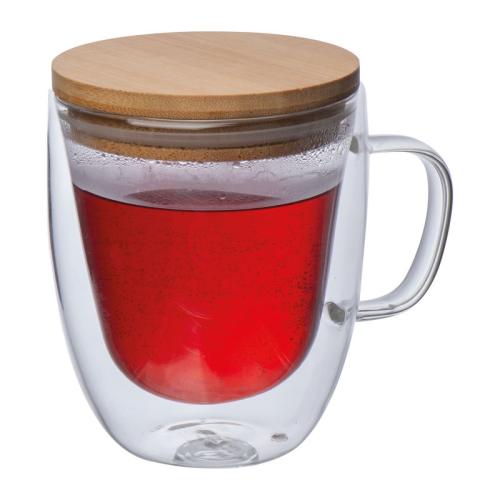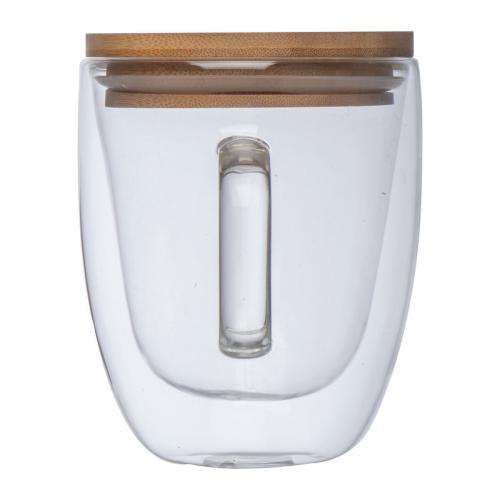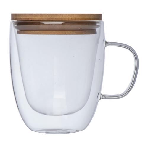 Double-walled glass with handle, 350 ml filling capacity and lockable bamboo lid.
