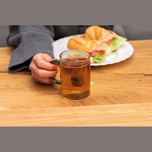 Glass mug with coloured handle and a capacity of 250 ml.