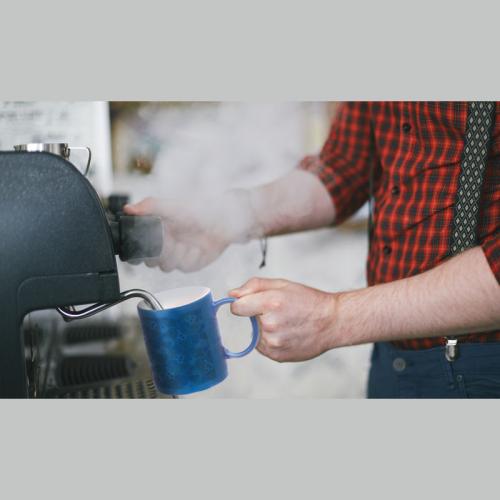 Effective sublimation mug: when cold the imprint vanishes under the coloured lacquering. As soon as hot liquid is filled in, the coloured imprint appears.