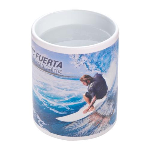 Effective sublimation mug: when cold the imprint vanishes under the coloured lacquering. As soon as hot liquid is filled in, the coloured imprint appears.