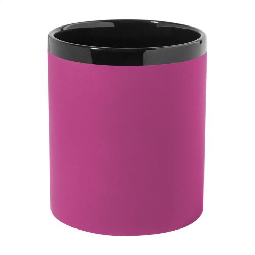 Ceramic mug with soft-touch rubberized finish and black inside and rim, 300 ml. With special coating for engraving, the engraved logo is matching the inside colour. In kraft paper box.