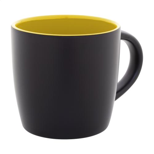 Black ceramic mug with coloured inside, 300 ml. With special coating for engraving, the engraved logo is matching the inside colour. In kraft paper box.