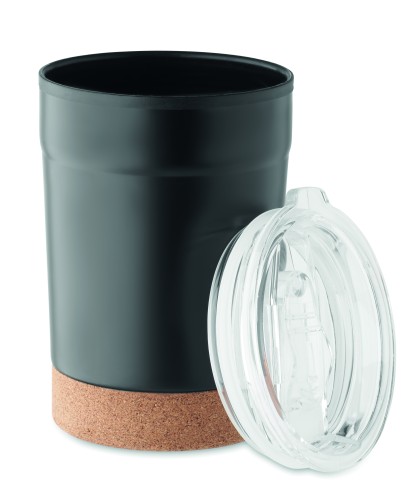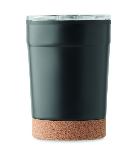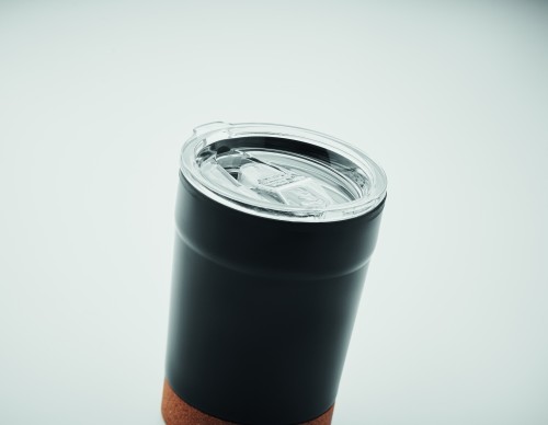 Double wall tumbler with stainless steel outer and PP liner inside, with cork base and with sliding sip hole. Leak-free. Capacity: 300 ml.