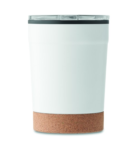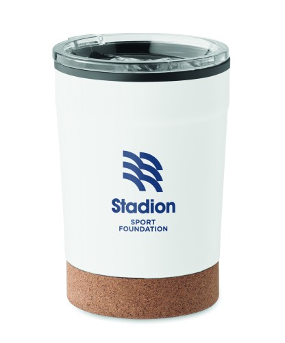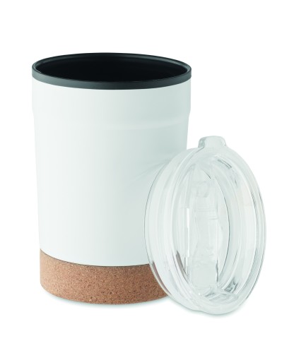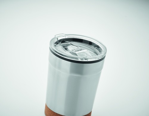 Double wall tumbler with stainless steel outer and PP liner inside, with cork base and with sliding sip hole. Leak-free. Capacity: 300 ml.