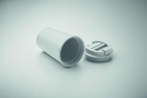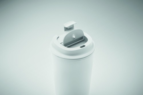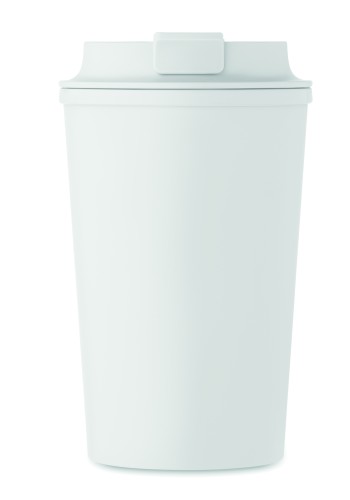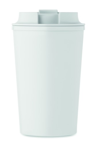 Double wall tumbler in 100% PLA corn with PP drinking lid with inner TPR. Leak free. Capacity: 350 ml.
