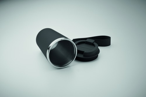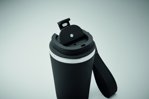 Double wall tumbler in recycled stainless steel (90% recycled stainless steel and 10% stainless steel) with PP outside layer with RPET wrist strap. Capacity: 350 ml.