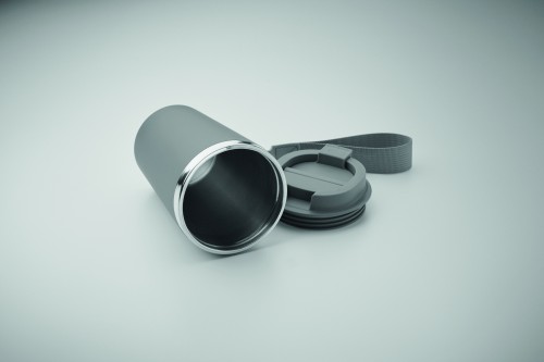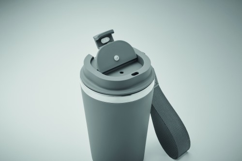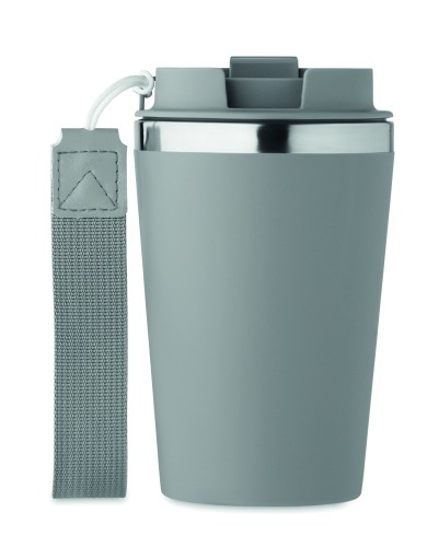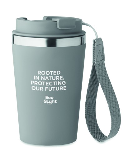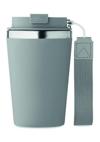 Double wall tumbler in recycled stainless steel (90% recycled stainless steel and 10% stainless steel) with PP outside layer with RPET wrist strap. Capacity: 350 ml.