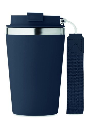 Double wall tumbler in recycled stainless steel (90% recycled stainless steel and 10% stainless steel) with PP outside layer with RPET wrist strap. Capacity: 350 ml.