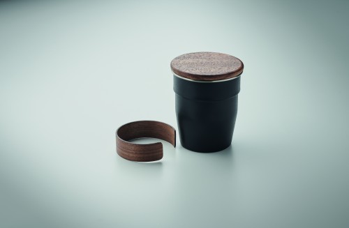 Single wall tumbler in recycled stainless steel (90% recycled stainless steel and 10% stainless steel) with walnut grip and lid. Capacity: 350 ml. Remove grip for cleaning. As this is a single walled mug heat transfer can still occur.
