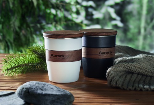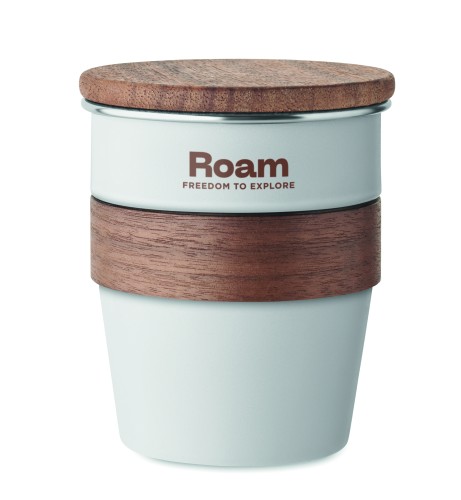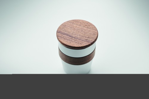 Single wall tumbler in recycled stainless steel (90% recycled stainless steel and 10% stainless steel) with walnut grip and lid. Capacity: 350 ml. Remove grip for cleaning. As this is a single walled mug heat transfer can still occur.