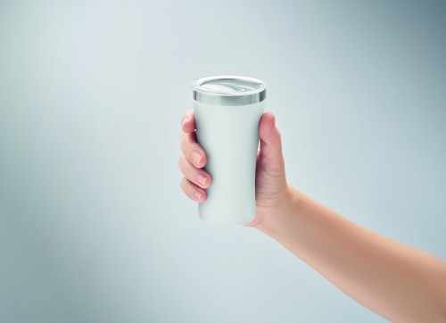 Small double wall vacuum insulated tumbler in recycled stainless steel (90% recycled stainless steel and 10% stainless steel) with drinking hole in the lid in transparent PP. Capacity: 160 ml.