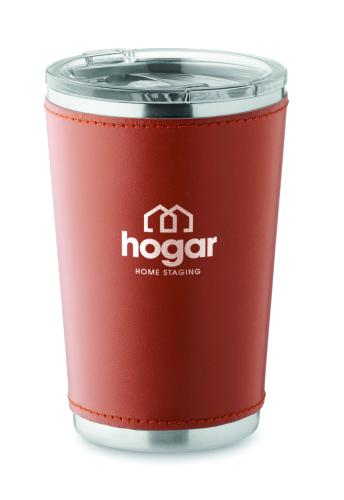 Double wall tumbler in recycled stainless steel (90% recycled stainless steel and 10% stainless steel) with removable PU leather sleeve. Lid with sliding sip hole. Leak-free. Capacity: 350 ml.