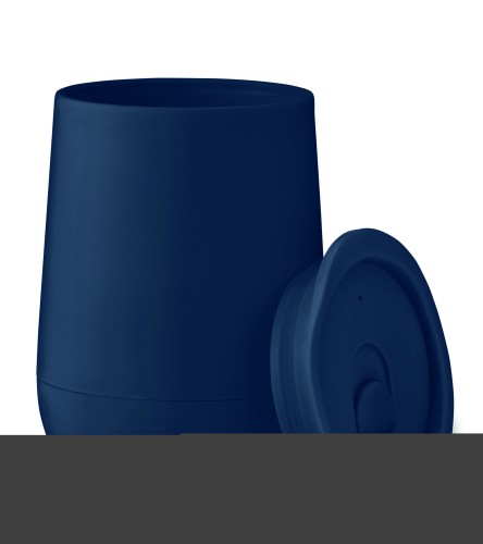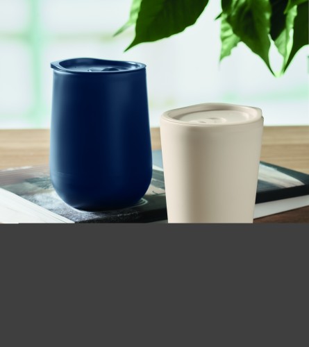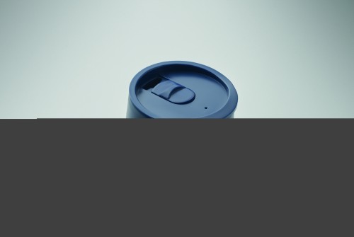 Double wall tumbler in PP with slide cover mouthpiece lid in PS and ABS. Capacity: 300 ml.