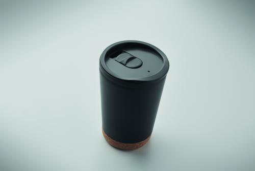 Double wall tumbler in PP with cork base and slide closing drinking mouthpiece lid in PS. Capacity: 300 ml.