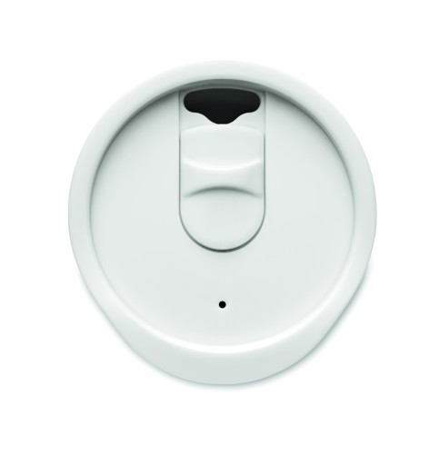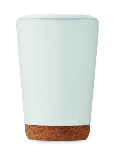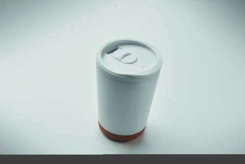 Double wall tumbler in PP with cork base and slide closing drinking mouthpiece lid in PS. Capacity: 300 ml.