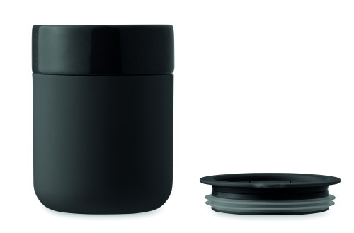 Ceramic tumbler with silicone sleeve and PP lid. Capacity: 330 ml.