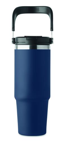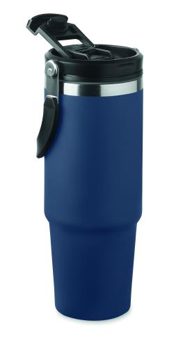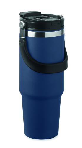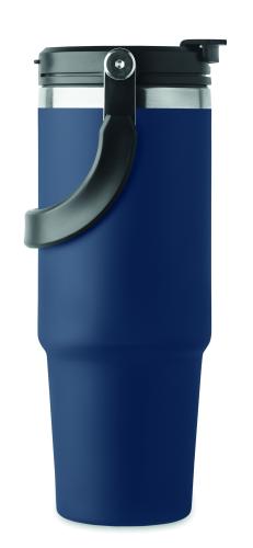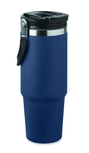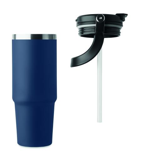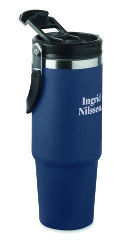 Double wall recycled stainless steel (90% recycled stainless steel and 10% stainless steel) tumbler with lid with inner straw, foldable mouth piece and direct drinking opening . Capacity 850 ml. Leak free.