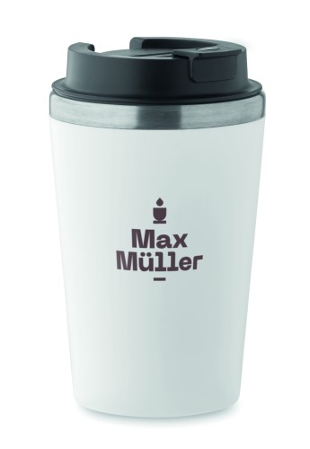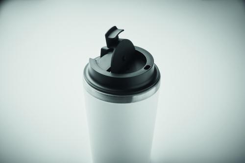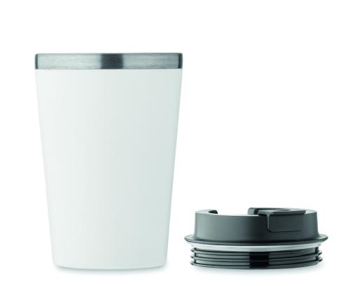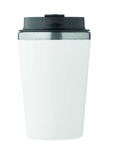 Double wall tumbler in PP outer wall with inner wall in recycled stainless steel (90% recycled stainless steel and 10% stainless steel) with a ceramic inner lining. Leak-free. Capacity: 350 ml.