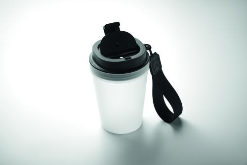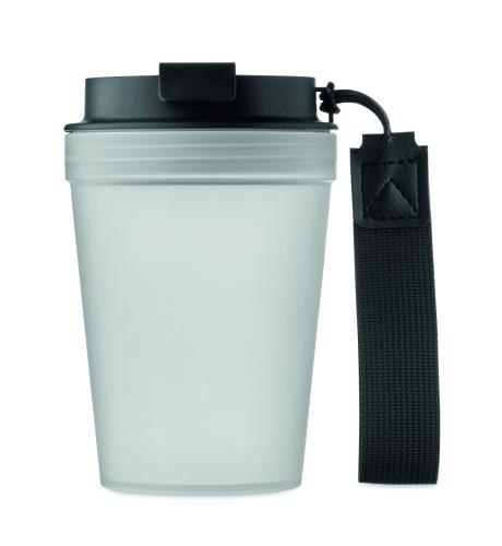 Single wall tumbler in PP, with RPET polyester strap. Leak-free. Capacity: 300 ml. As this is a single walled tumbler, heat transfer can still occur.