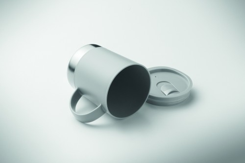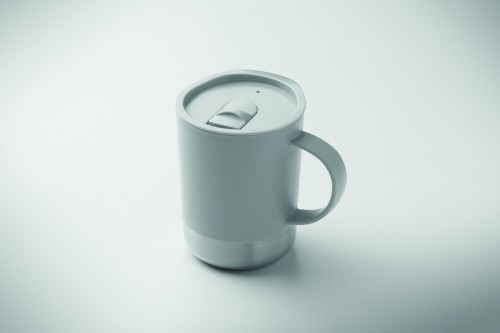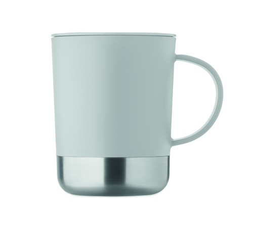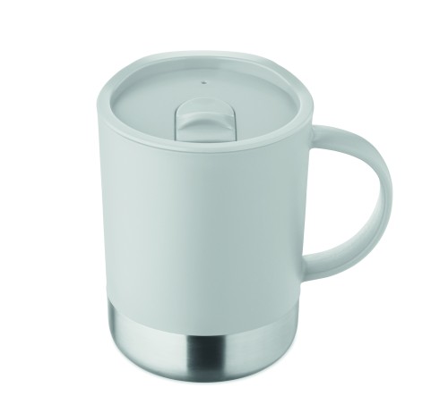 PP mug with recycled stainless steel base (90 % recycled stainless steel and 10% stainless steel) and PP sliding lid. Capacity: 300 ml.