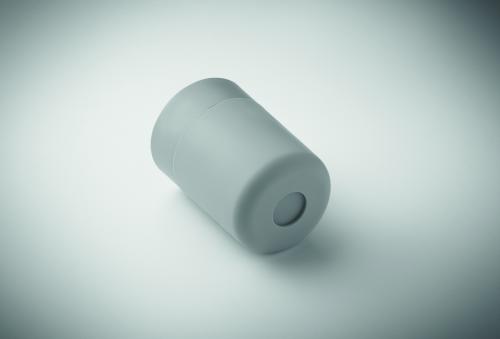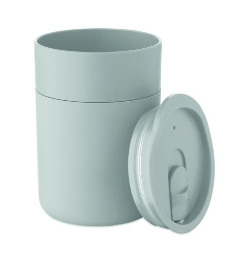 PP tumbler with silicone sleeve and PP sliding lid. Capacity: 330 ml. As this is a single walled mug, heat transfer can still occur.