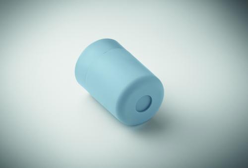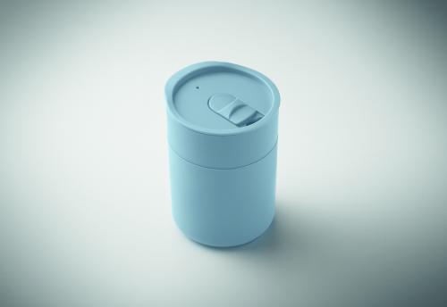 PP tumbler with silicone sleeve and PP sliding lid. Capacity: 330 ml. As this is a single walled mug, heat transfer can still occur.