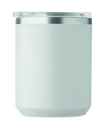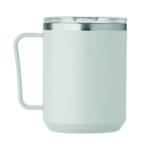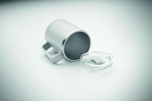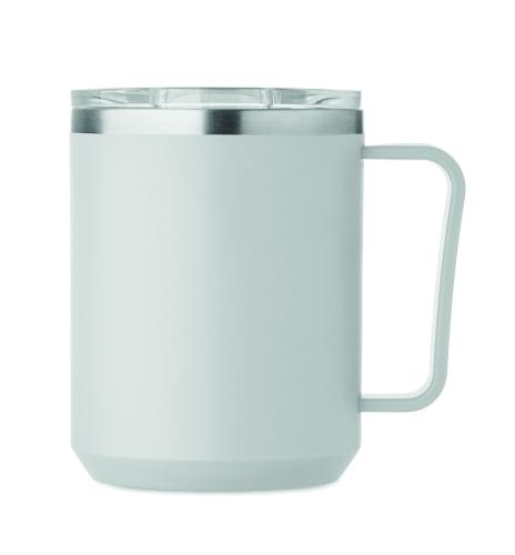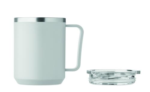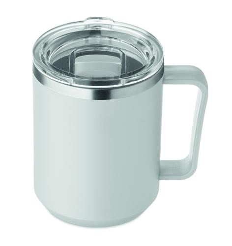 Double wall mug with 90 % recycled stainless steel and 10% stainless steel interior and recycled PP exterior. Includes transparent AS sliding lid. Capacity 400ml.